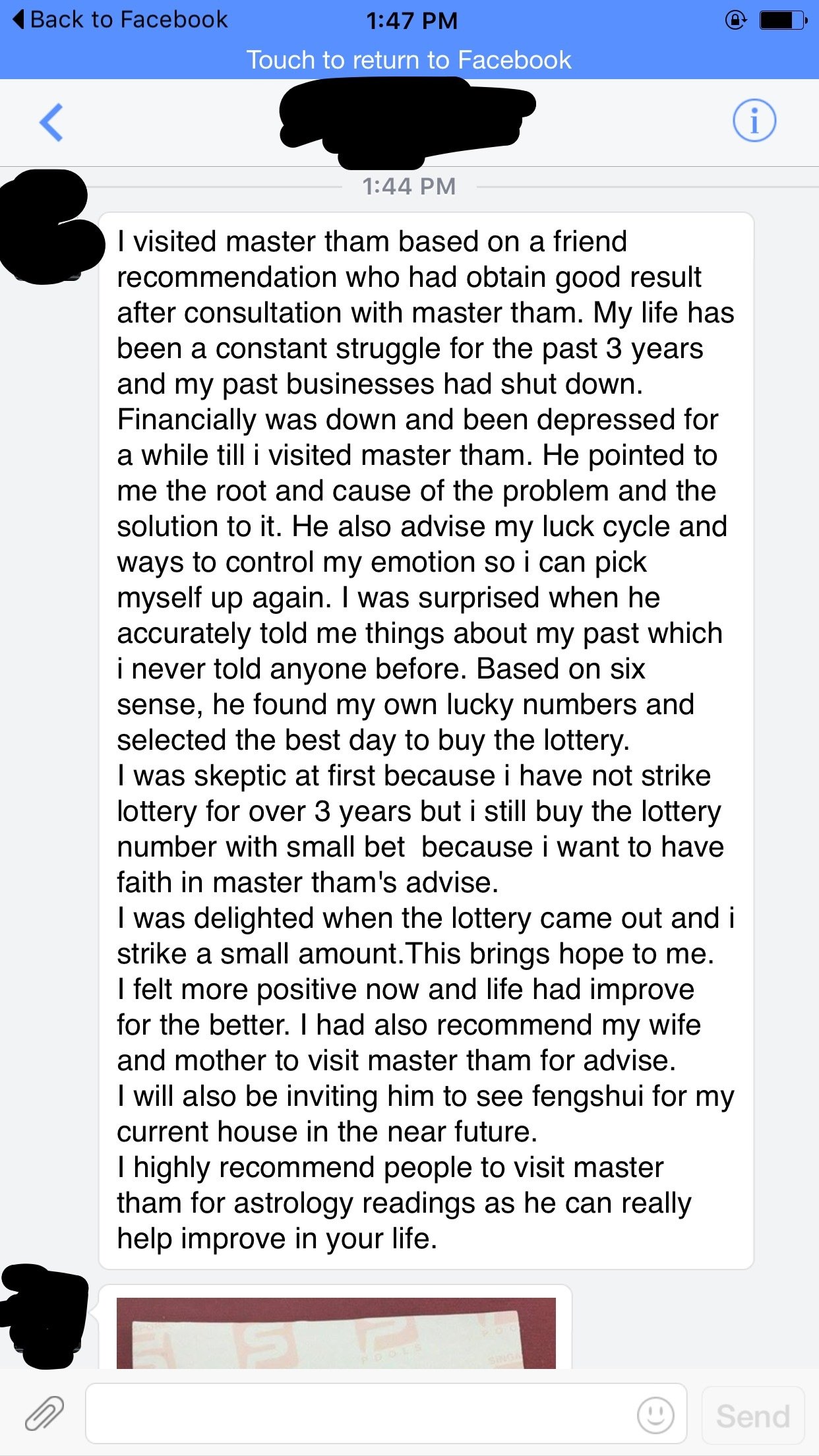 “I visited master tham based on a friend recommendation who had obtain good result after consultation with master tham. My life has been a constant struggle for the past 3 years and my past businesses had shut down. Financially was down and been depressed for a while till i visited master tham. He pointed to me the root and cause of the problem and the solution to it. He also advise my luck cycle and ways to control my emotion so i can pick myself up again. I was surprised when he accurately told me things about my past which i never told anyone before. Based on six sense, he found my own lucky numbers and selected the best day to buy the lottery.